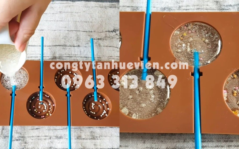 Đặt khuôn kẹo lên mặt phẳng, sau đó cho các que kẹo vào đúng vị trí so với khuôn tiếp đến là đổ lần lượt hỗn hợp kẹo đã pha ở bước 1 cho đầy hết tất cả các khuôn và đợi kẹo đông cứng lại.