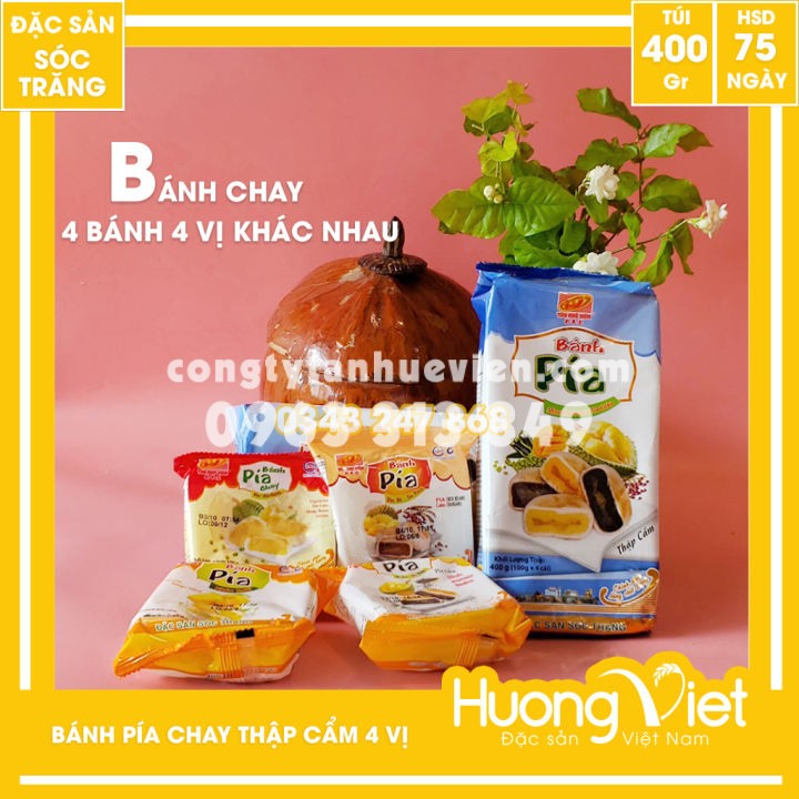 Bánh pía chay chay thập cẩm là sản phẩm bánh chay mới nhất của Tân Huê Viên bao gồm 4 bánh 4 vị khác nhau: Bánh pía Đậu xanh sầu riêng, Bánh Pía Mè đen, Bánh Pía Đậu đỏ, Bánh Pía Xoài.